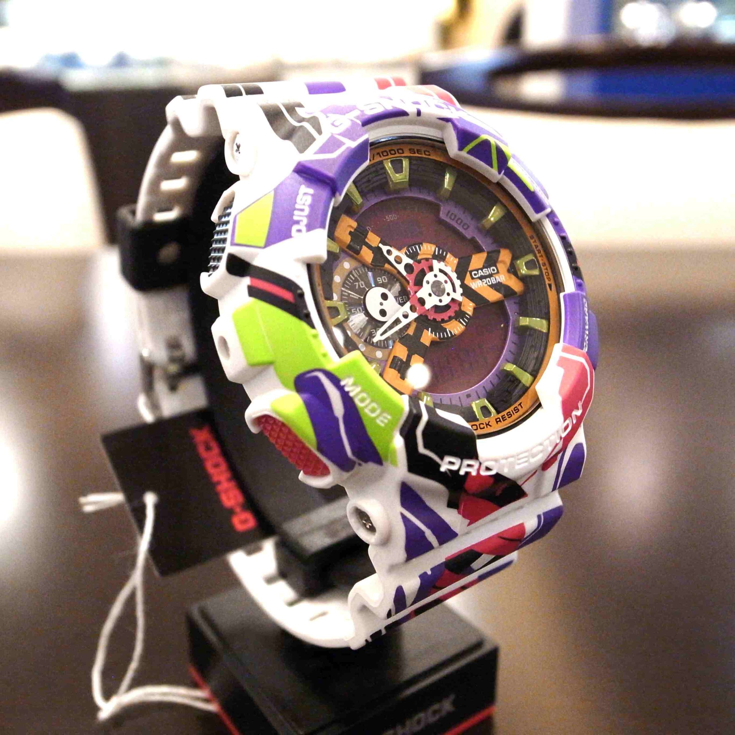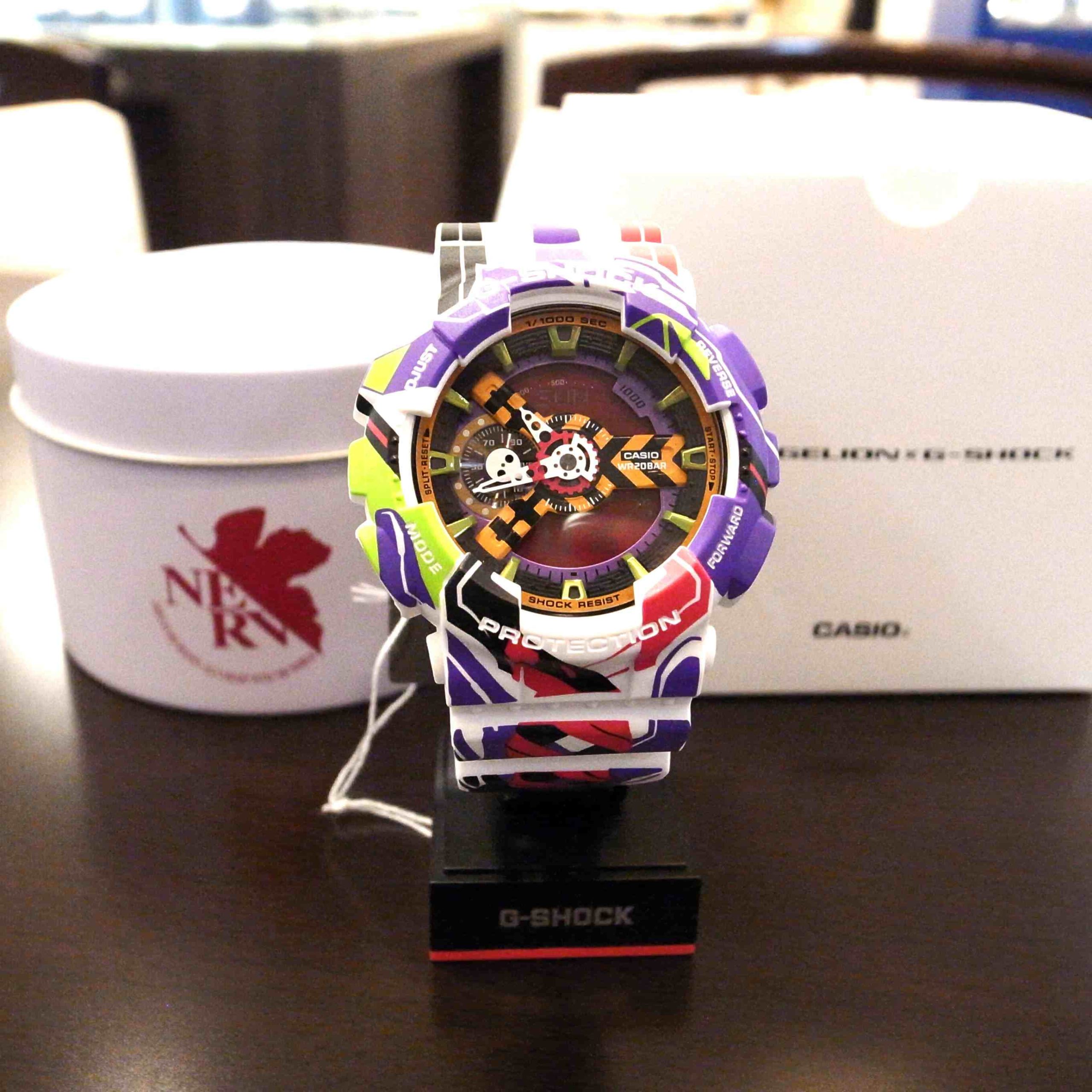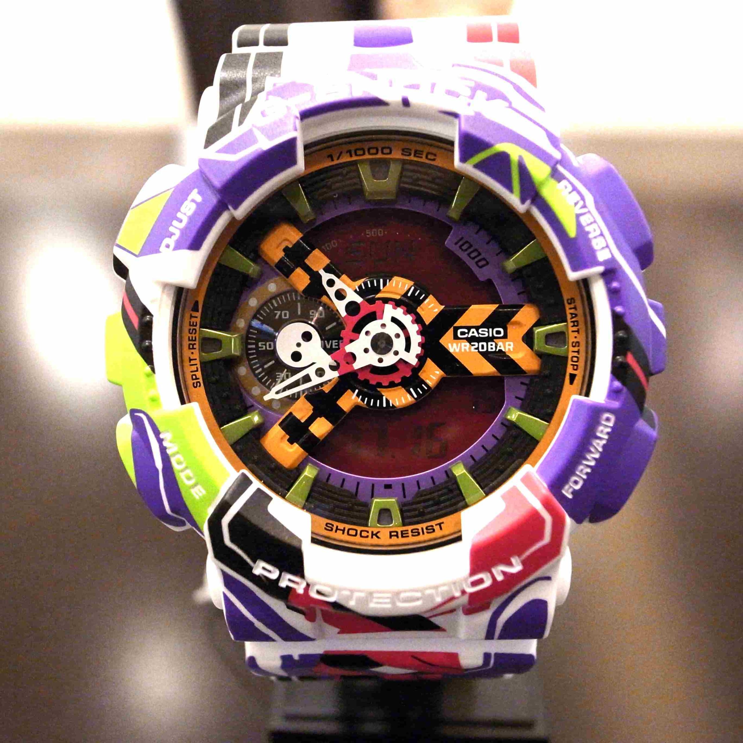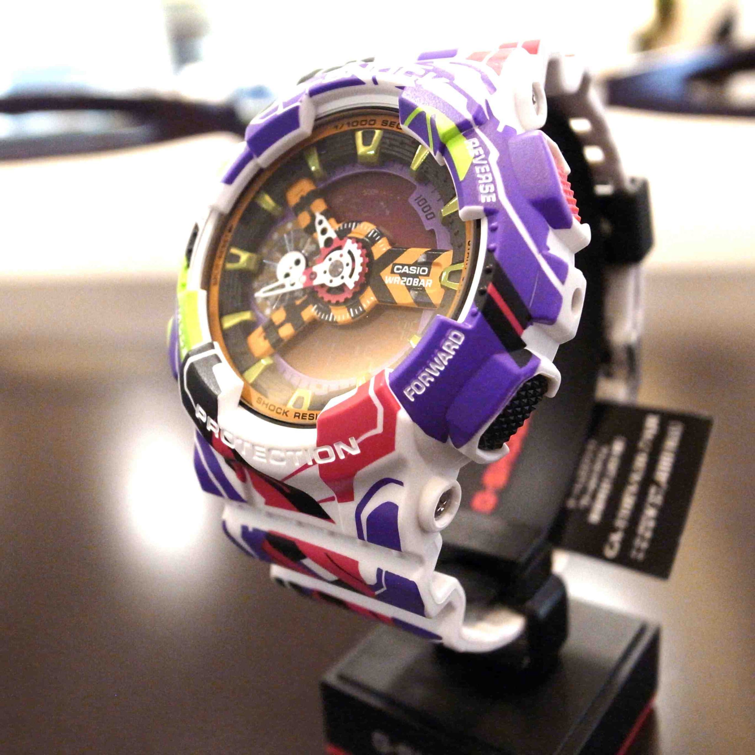 ベースモデルには、2010年の第1弾コラボレーションと同じくGA-110を採用。G-SHOCK全体にエヴァンゲリオンの意匠がちりばめられており、短バンドにはエヴァンゲリオン初号機の特徴的な角、ベゼル部分には初号機の顔、ベゼル下部から長バンドにかけてはロンギヌスの槍を握りしめ、今まさに投擲せんとする左腕がデザインされています。