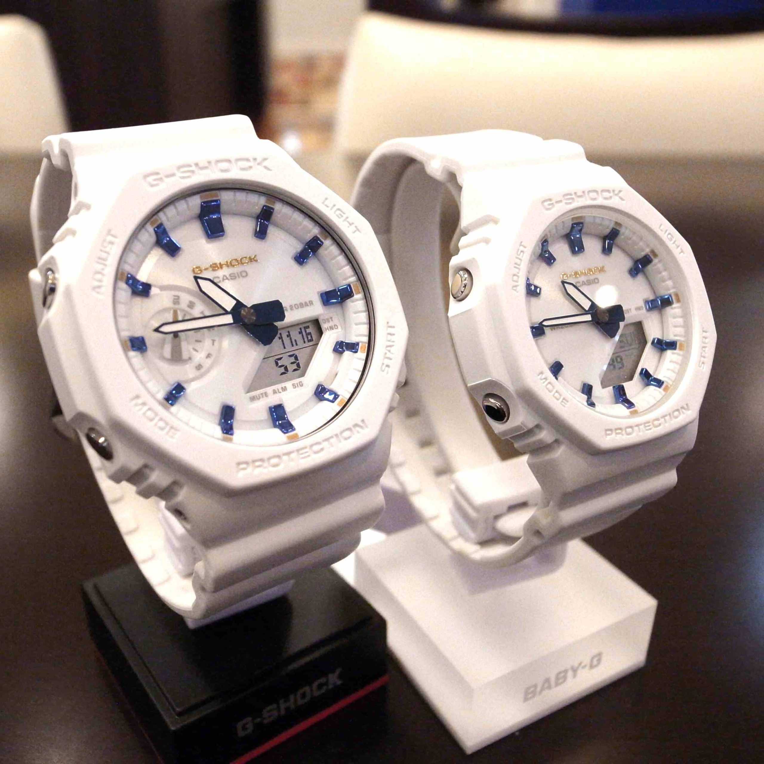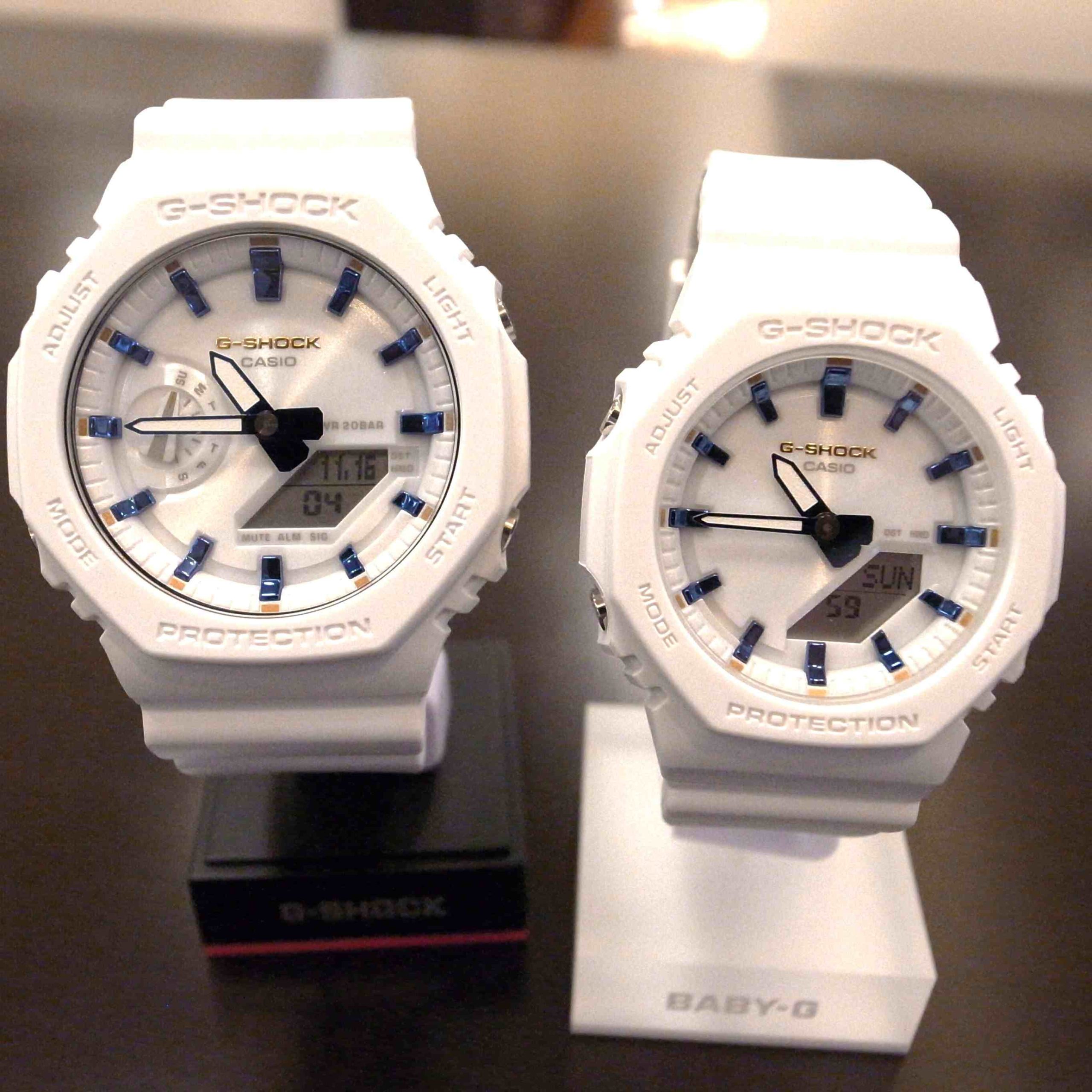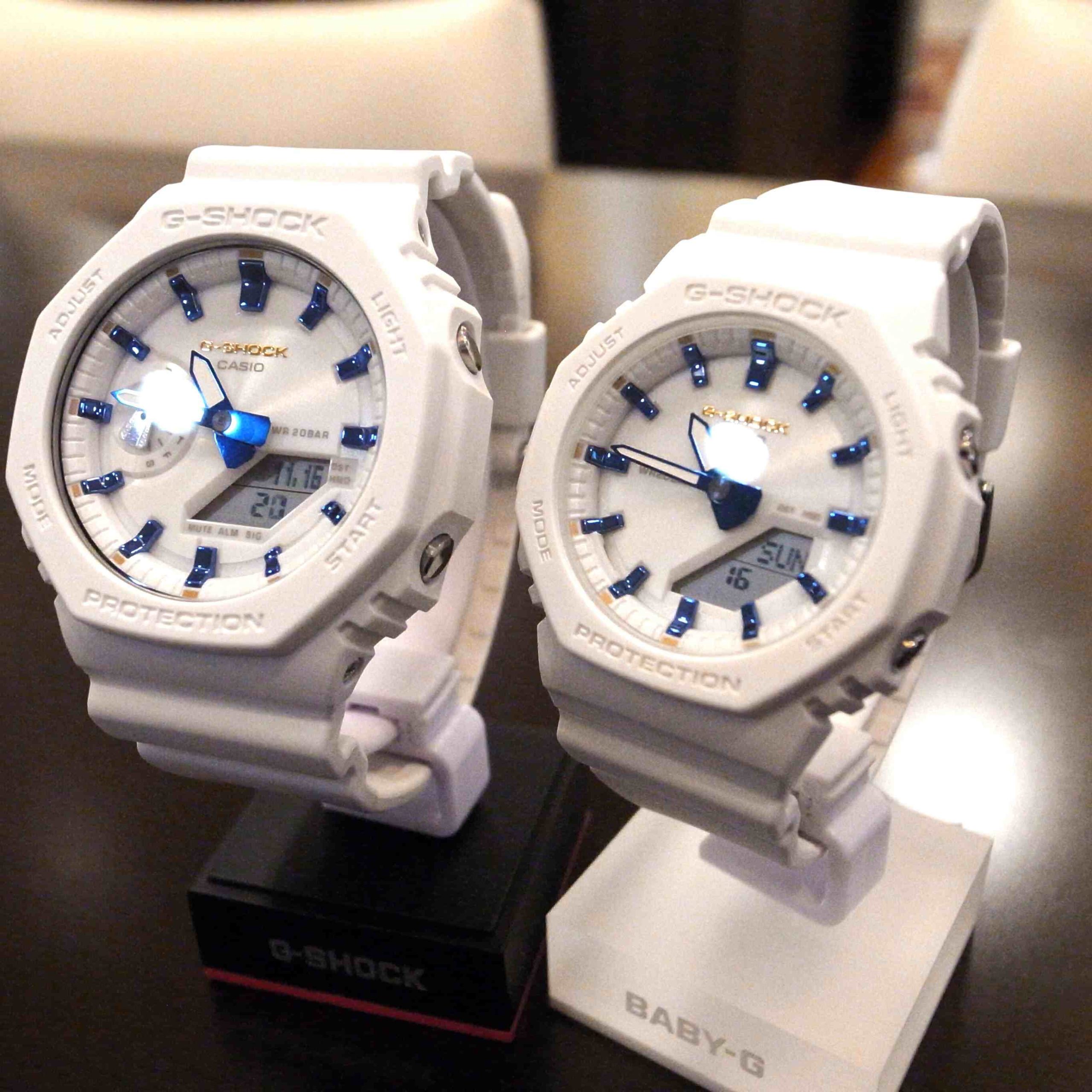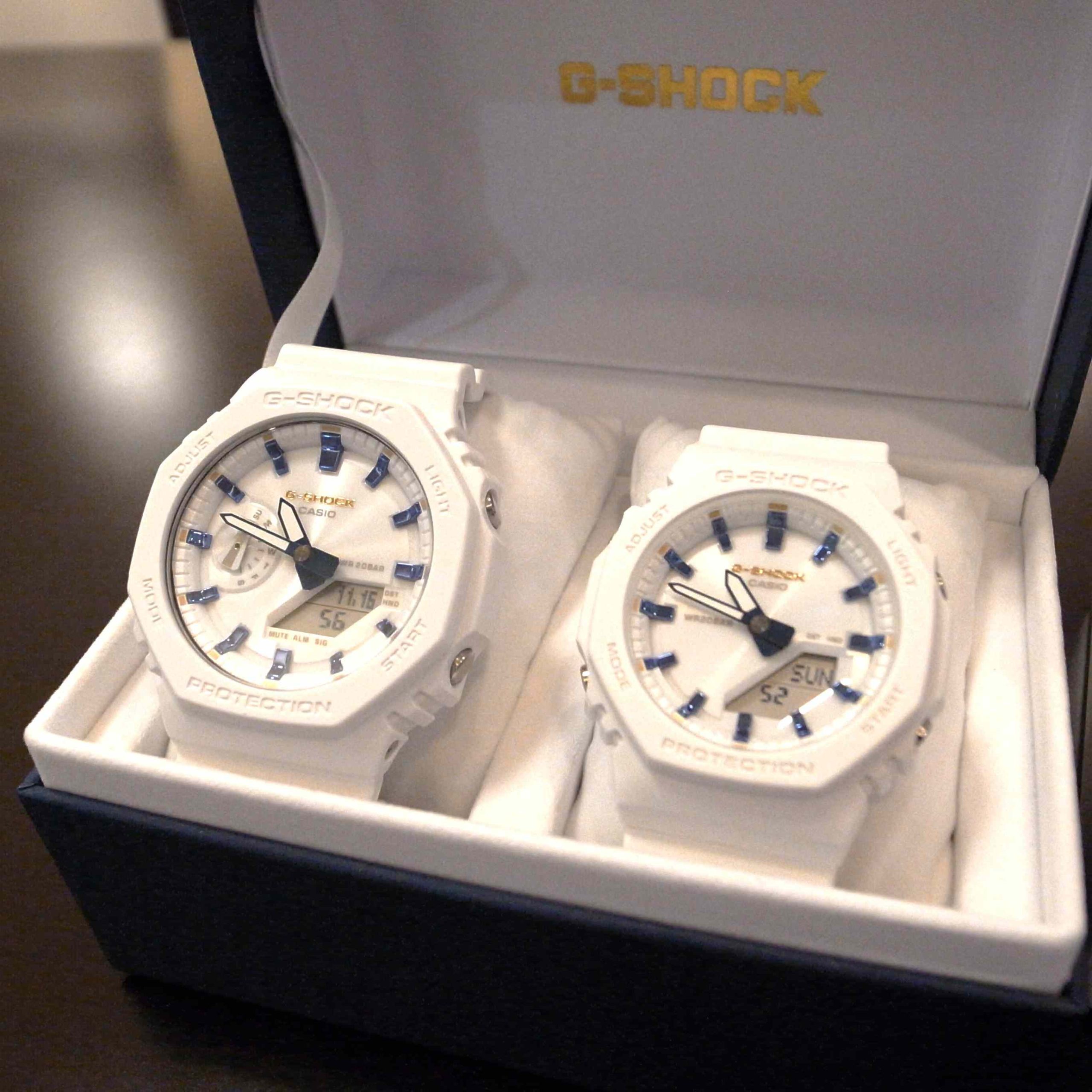 恋人たちに贈るクリスマス限定ペア「Gプレゼンツラバーズコレクション」より、2025年のクリスマスシーズンを彩るスペシャルモデルです。 クリスマスツリーのオーナメントをイメージしたホワイト×ブルーの爽やかなカラーで、普段使いできるデザインです。 ダイアルに透明蒸着を施し質感を高め、インデックスにはブルー蒸着を施し、シルバー・ゴールドの差し色がクリスマスの華やかさを演出。マットホワイトのベゼルとバンドに、G-SHOCKロゴおよびアワーマーカーのゴールドが特別感を添えます。裏蓋にはラバーズコレクションのシンボル「天使&悪魔」を刻印。大切な人との絆を見守ります。 スペシャルパッケージはホワイト×ブルーを基調とした特別感のある仕様に仕上げました。クリスマスの贈り物として、大切な人と共に身に着けたいモデルです。