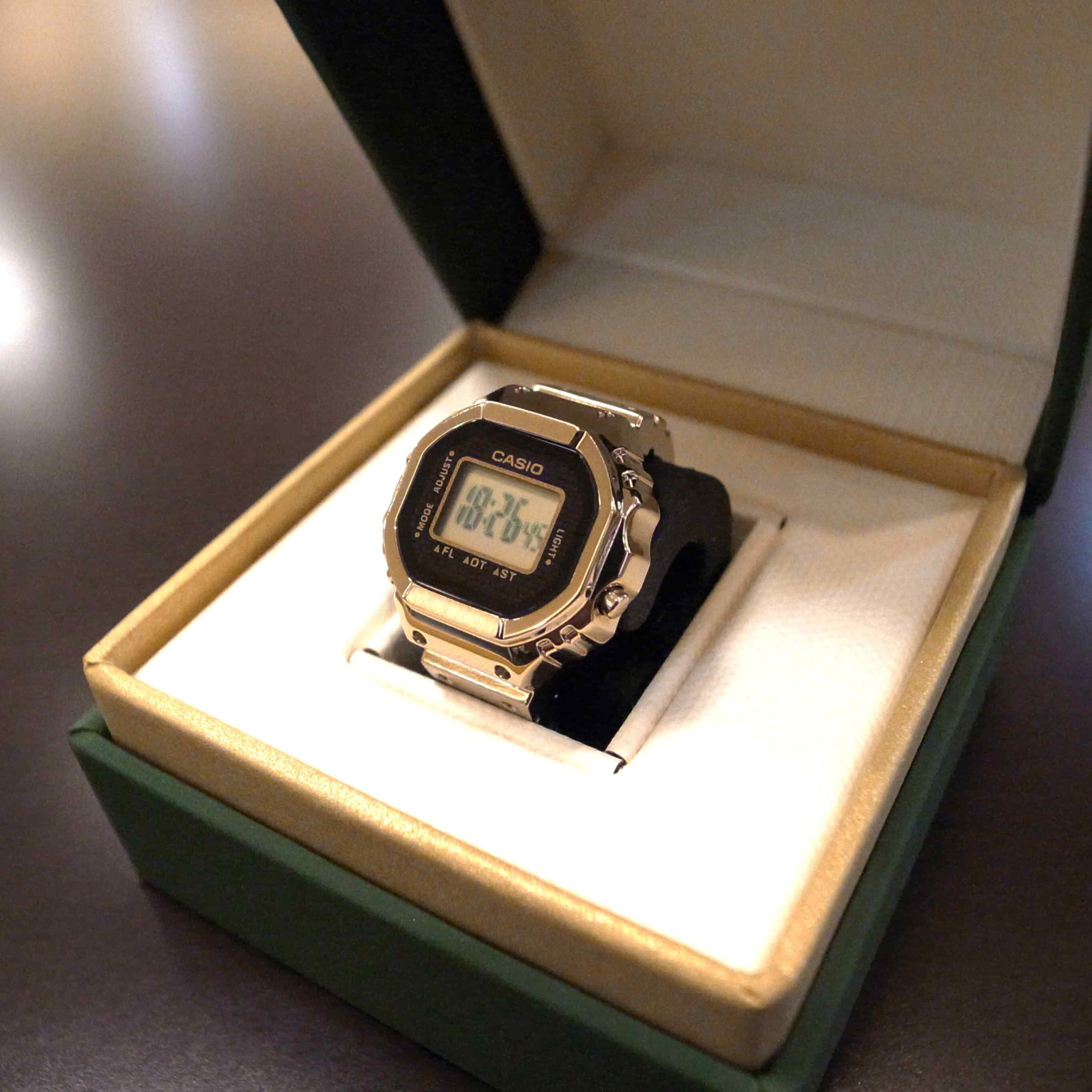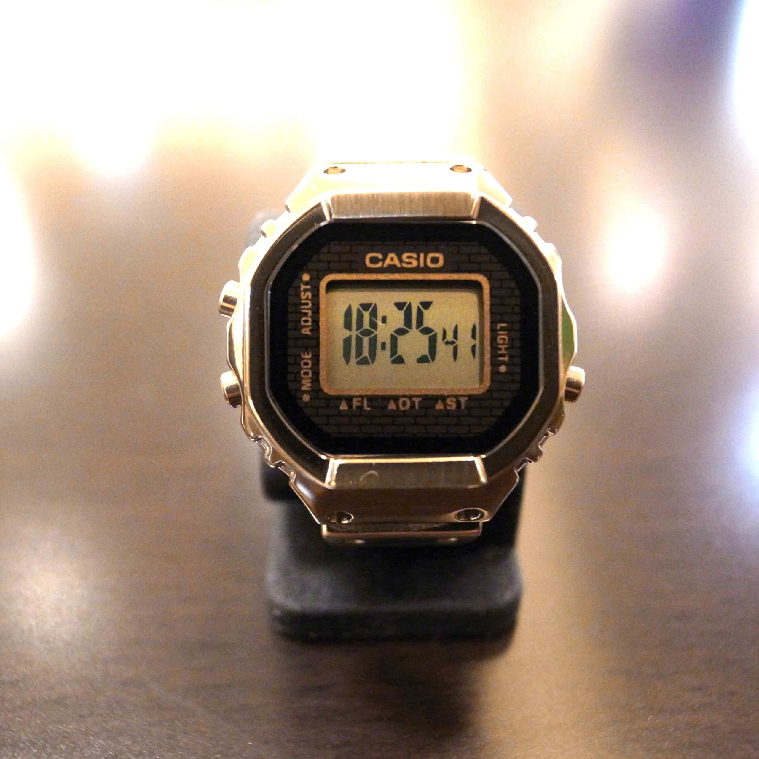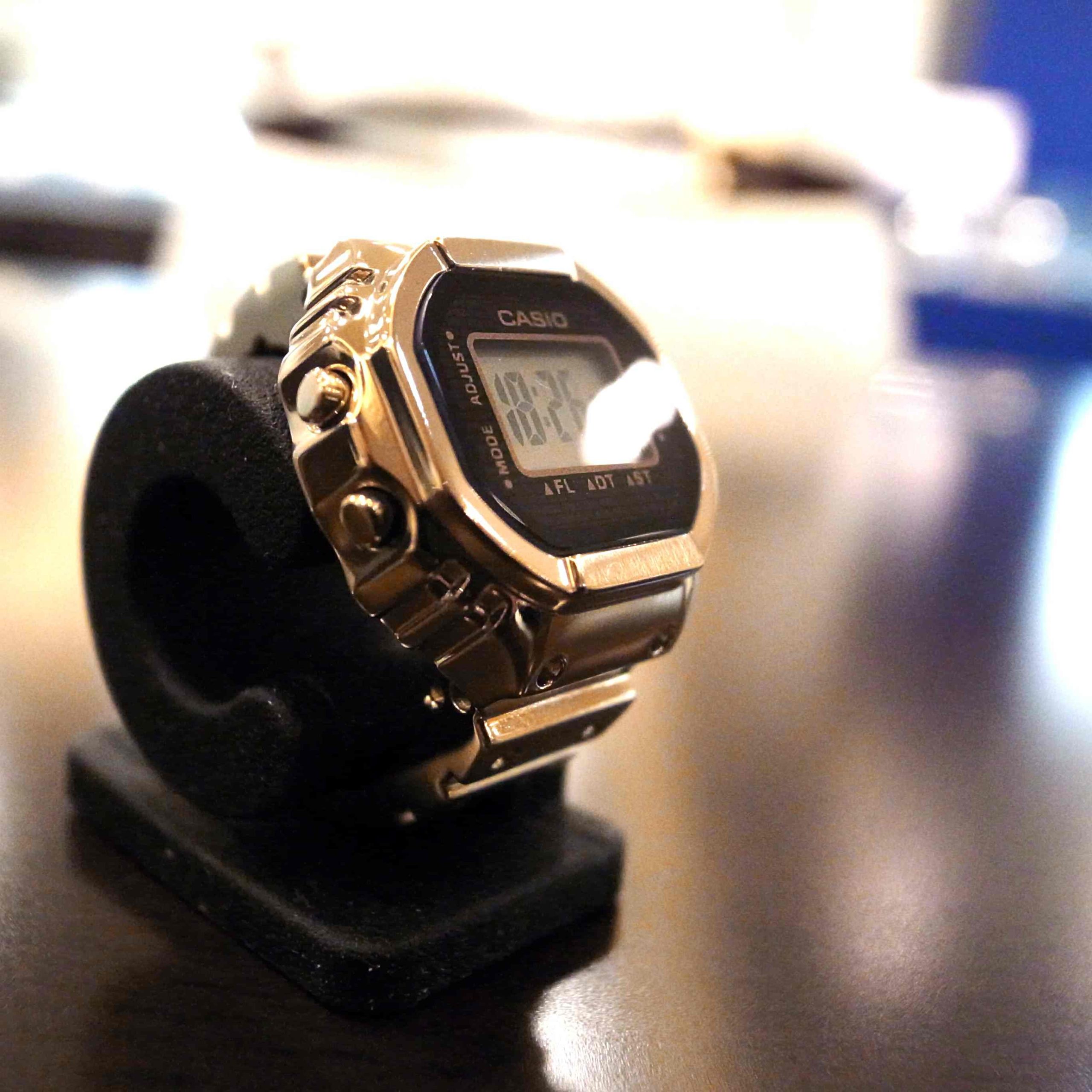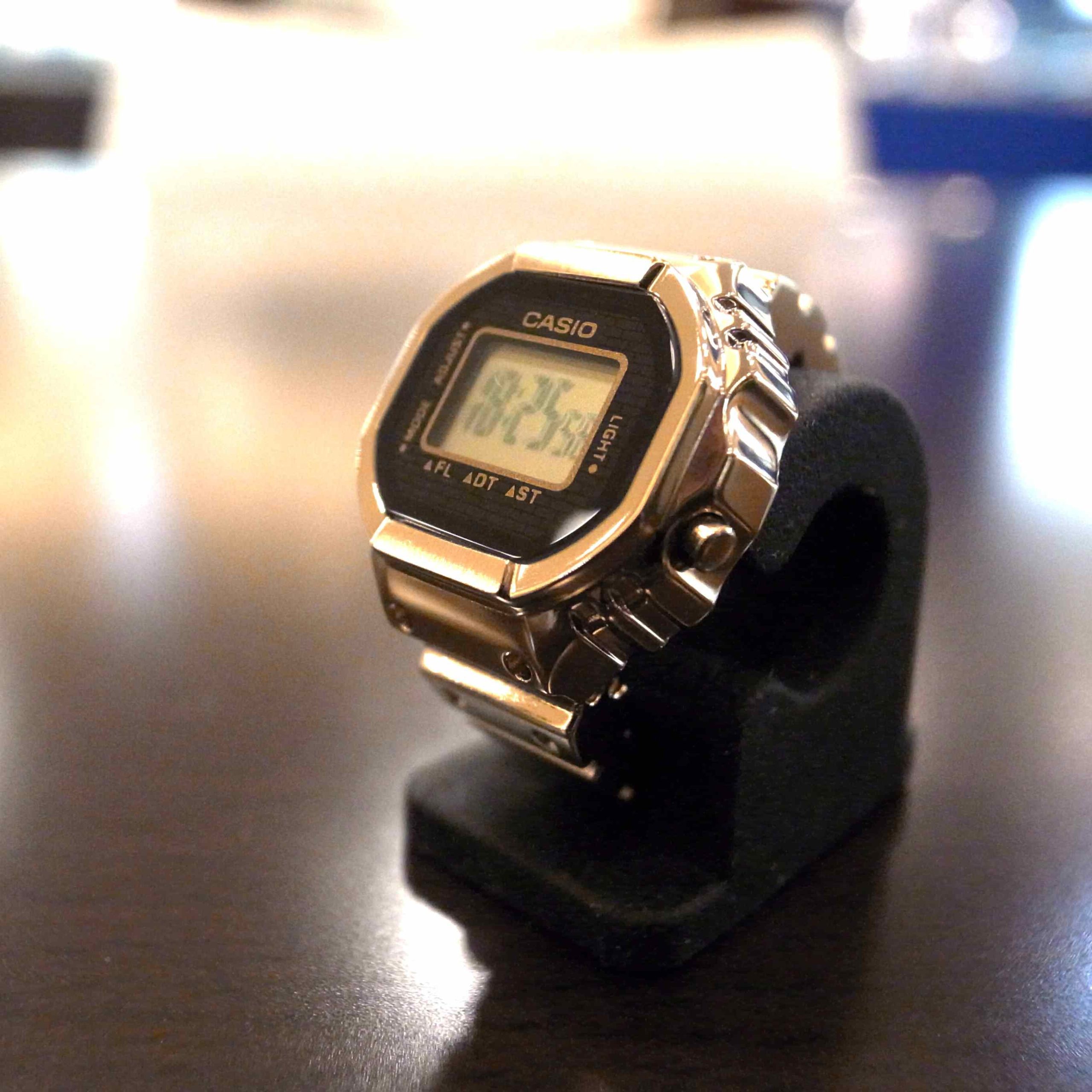 カシオウオッチのアイコニックなフォルムを指輪サイズのフルメタル造形で再現。粉末状の金属を射出成形するMIM(メタルインジェクションモールディング)により、ケースの複雑形状からバンド穴まで精密に作り込み、耐摩耗性に優れたゴールドカラーのIPで表面を美しくコーティングしました。ケース・裏蓋・リングの一体成形とガラス接着技術の採用により、電池交換可能な構造でありながら日常生活用防水を実現しています。