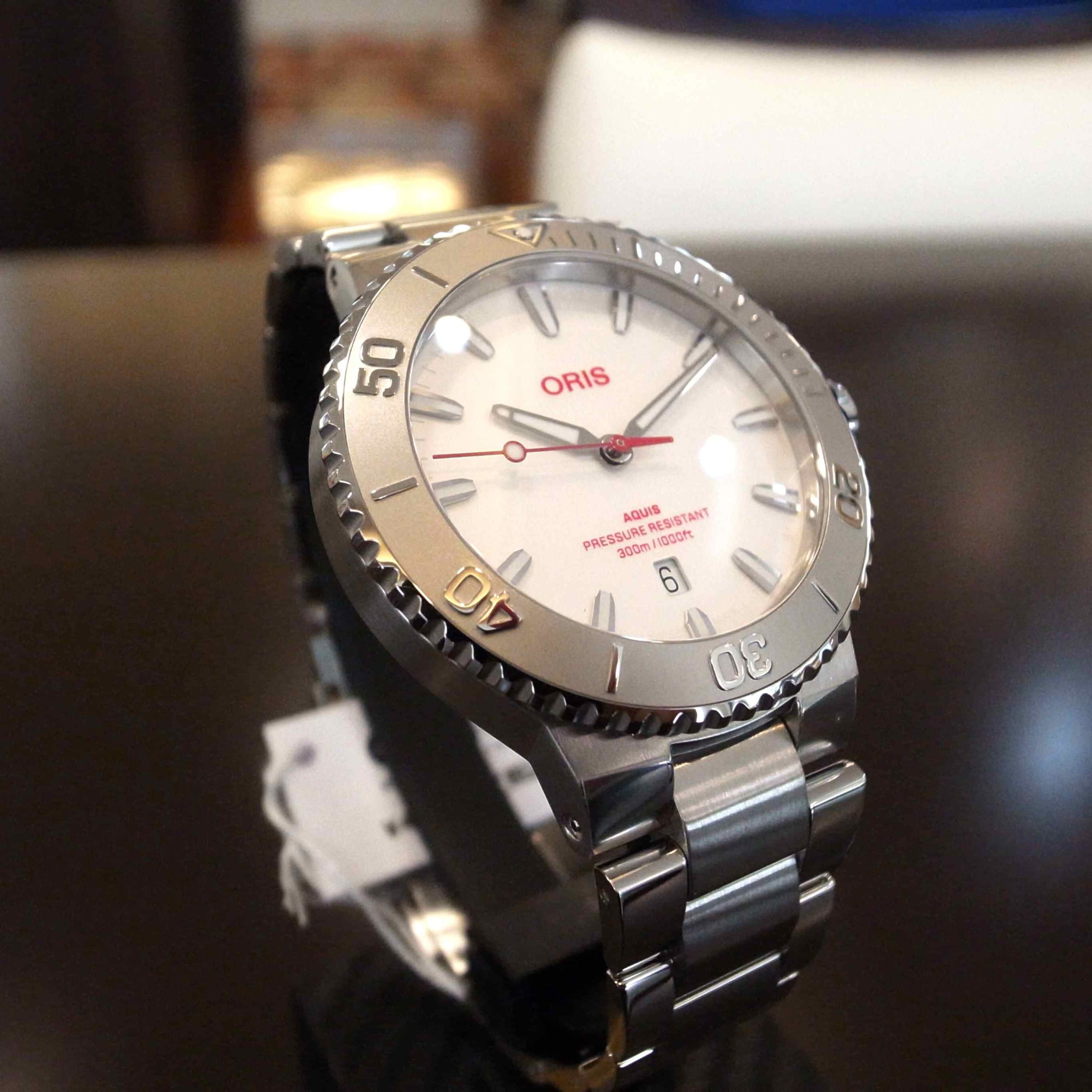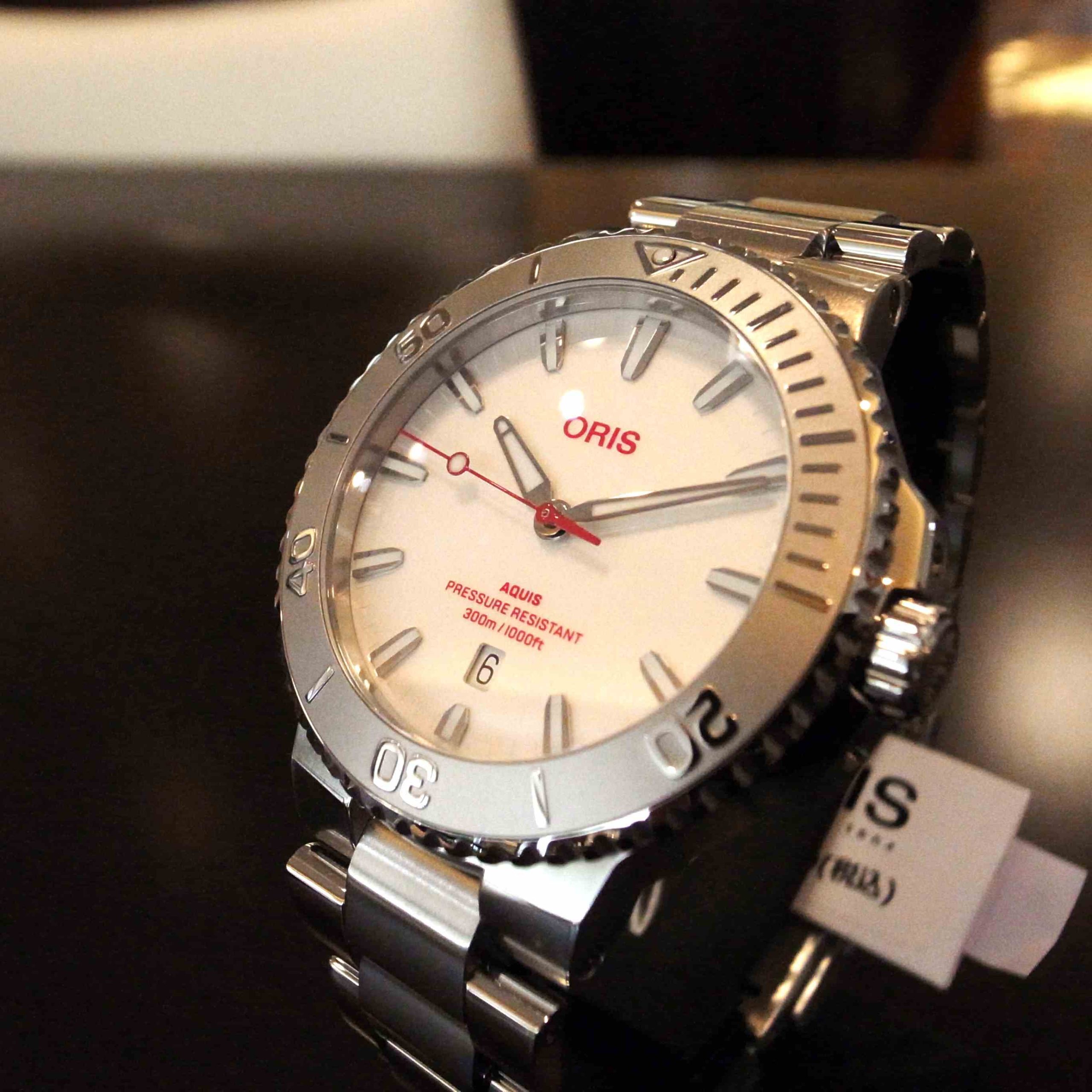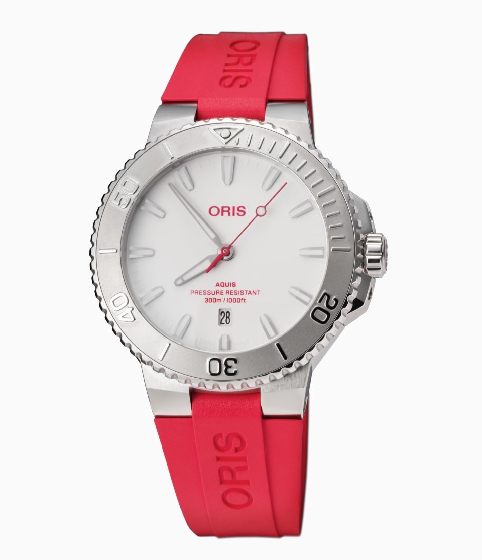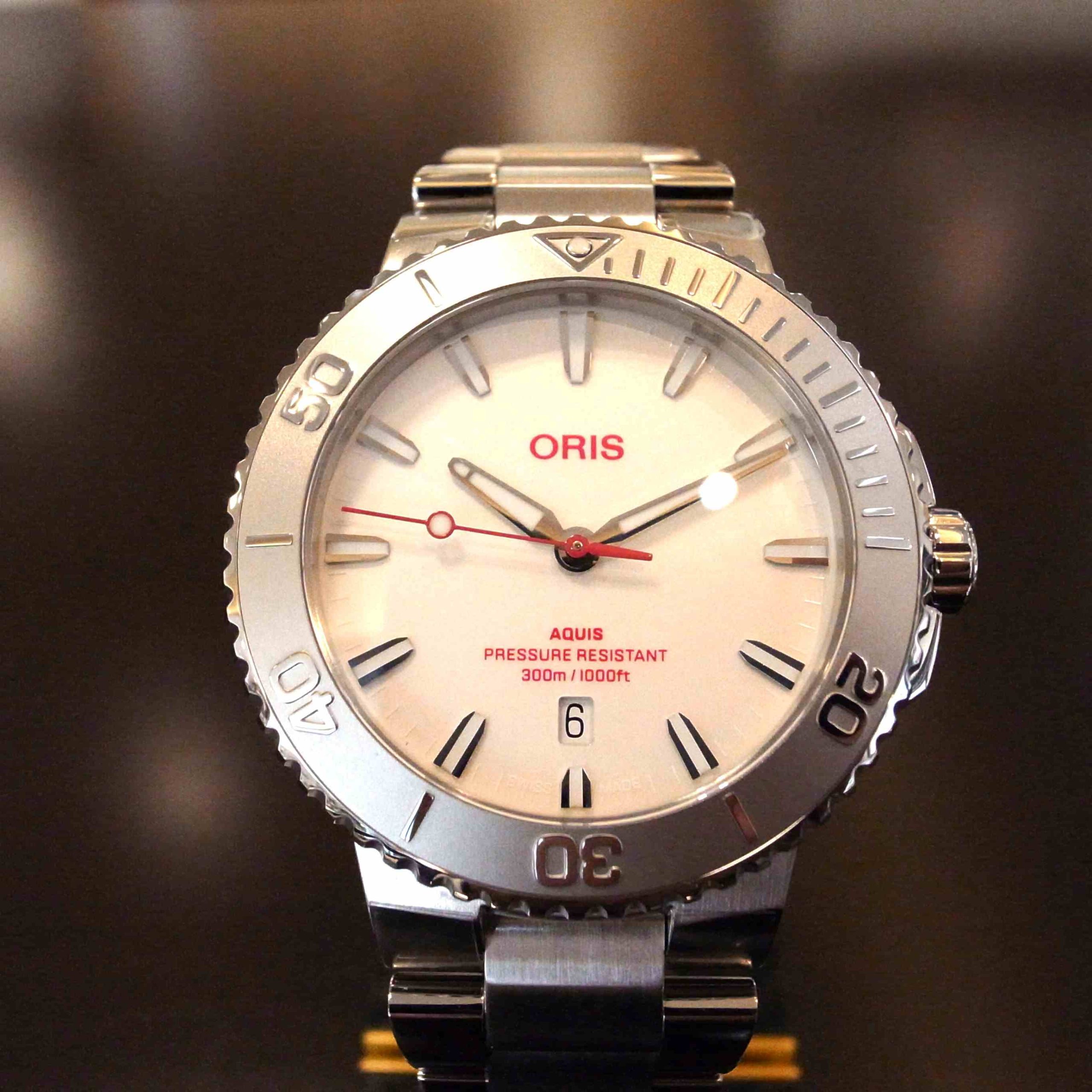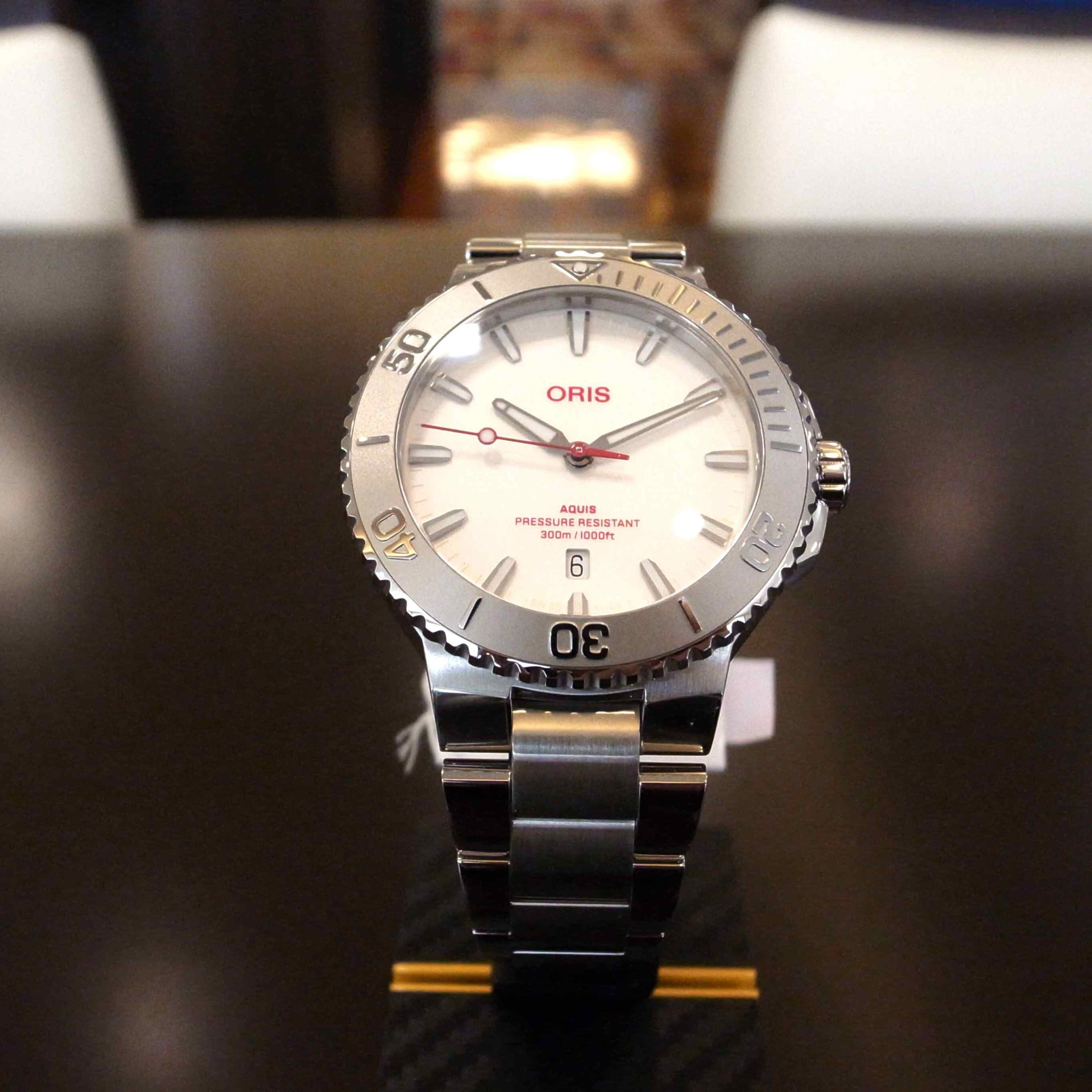中でも日本で特に人気の「アクイス デイト レリーフ」をベースにした日本限定モデルは、洗練されたホワイトダイヤルに鮮やかなレッドのロゴと秒針を配置した美しいデザインを特徴とします。